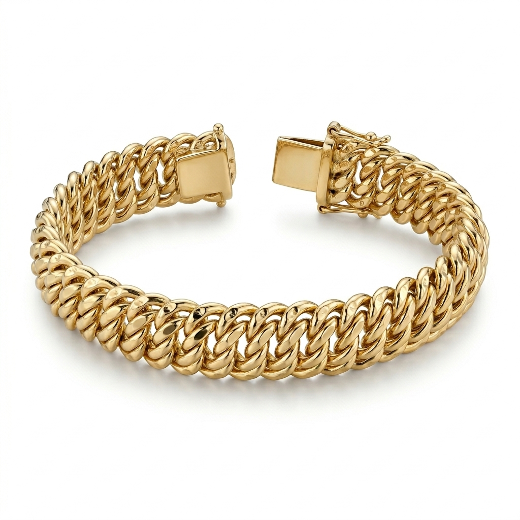 צמיד בעל נוכחות דומיננטית ועיצוב חוליות יוקרתי, המעניק מראה עשיר ועל-זמני. גימור מבריק ברמה הגבוהה ביותר עם סגירה בטיחותית כפולה.